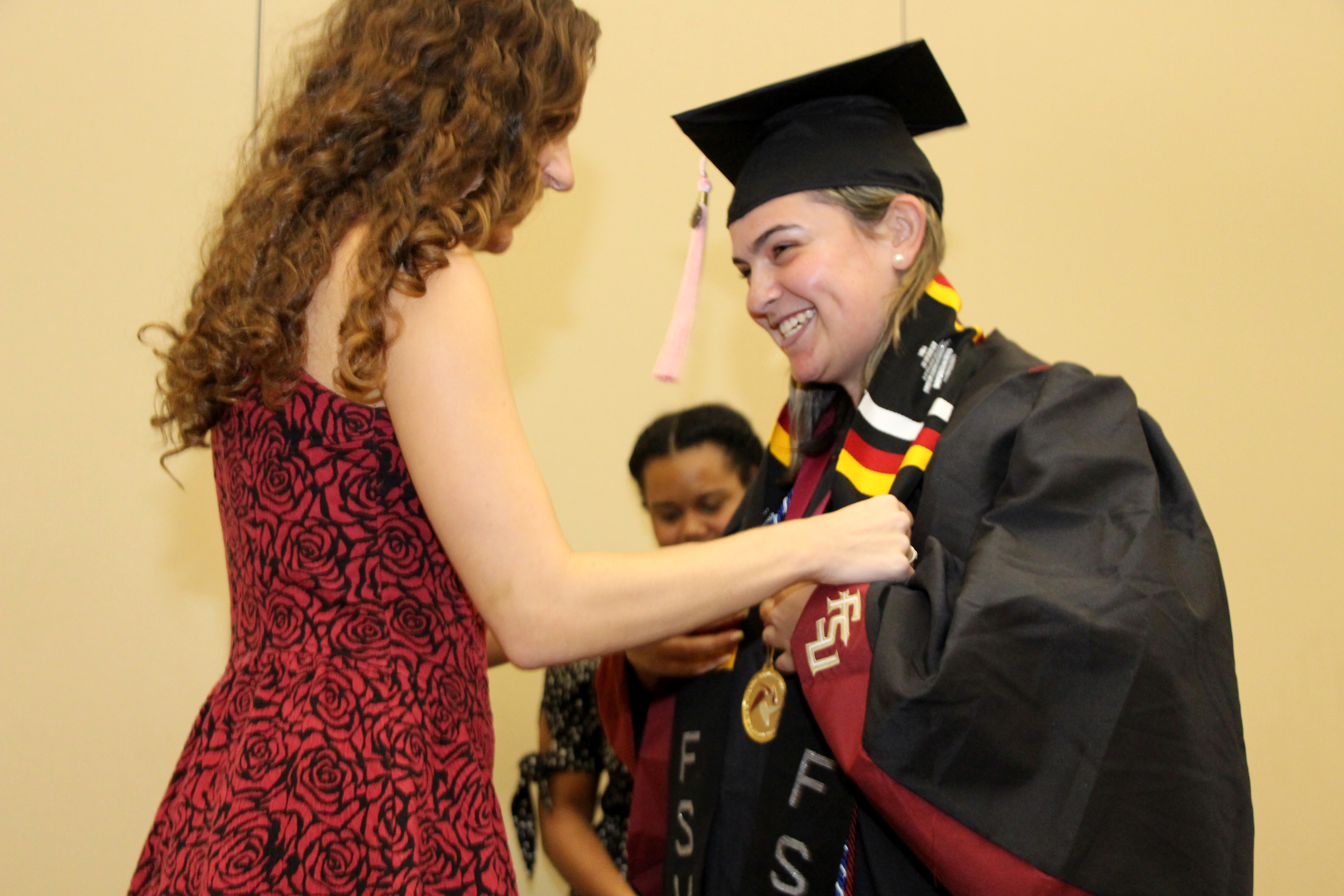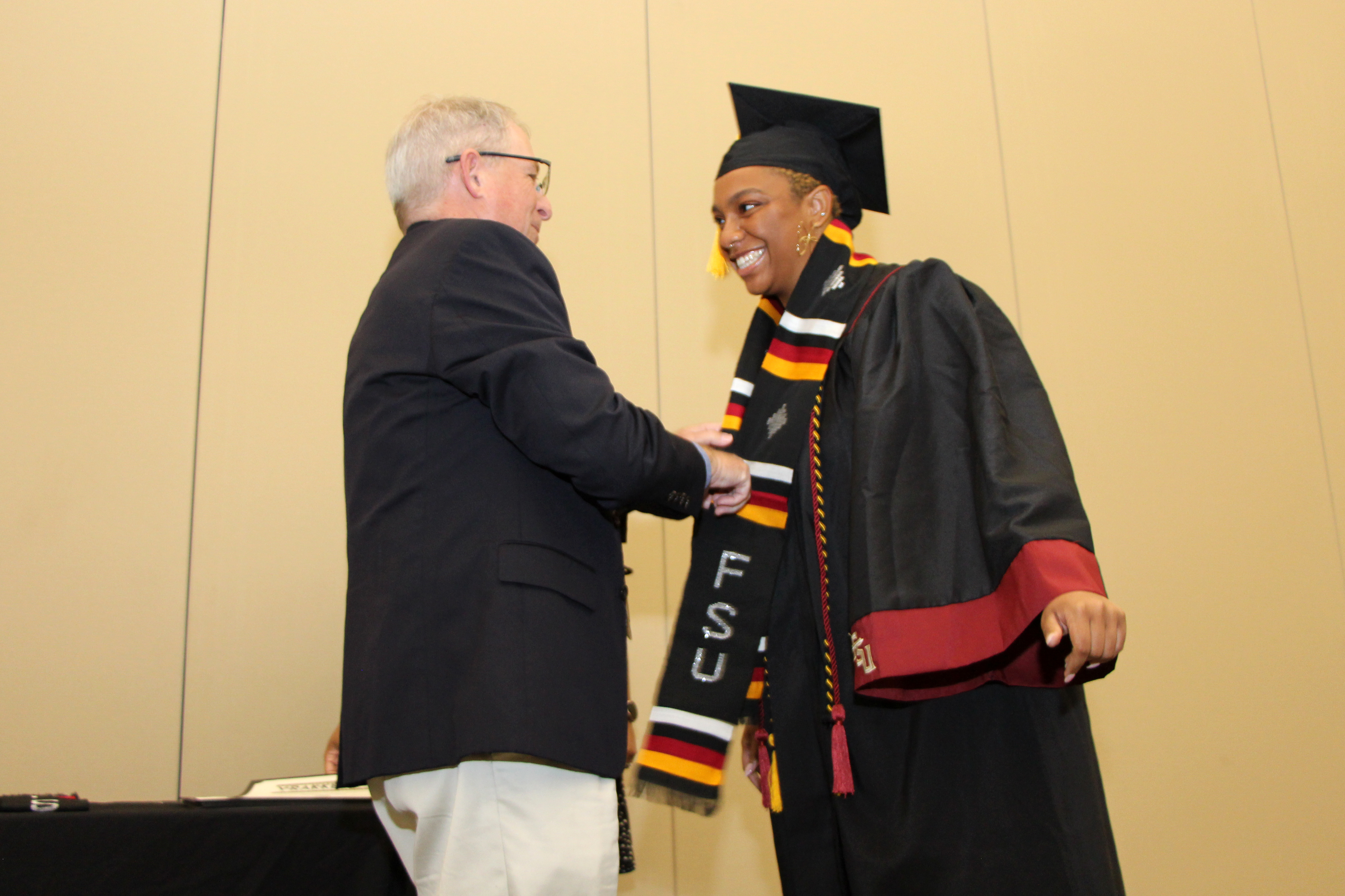 The participating graduates hail from all corners of campus and represent a variety of leadership roles, from orientation leaders to resident hall assistants to officers of numerous student organizations. Distinguishing itself from other graduation ceremonies, V-rak-ke-ce-tv is an intimate gathering focused on fostering a sense of belonging and celebrating graduating students’ circles of success throughout their time at FSU. Graduates are called upon one by one, their paths of study and achievements displayed for all to see, and each student is bestowed a stole bearing the four colors of the flag of the Seminole Tribe of Florida by a selected member of their support system. Graduates walked the ballroom stage and shared hugs and handshakes with their professors, advisors, friends and family.