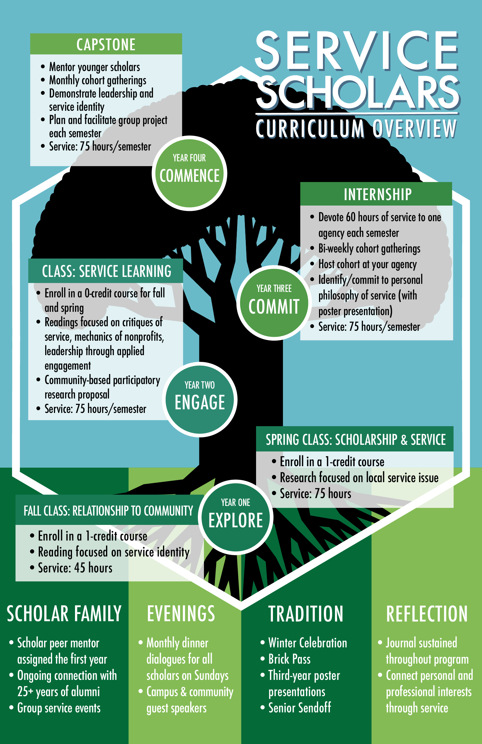 Since 2010, the Service Scholar program has featured a four-year curriculum. While some parts of this program remain the same throughout a scholar’s undergraduate years, many parts of the curriculum are specific to a scholar’s development within the program.