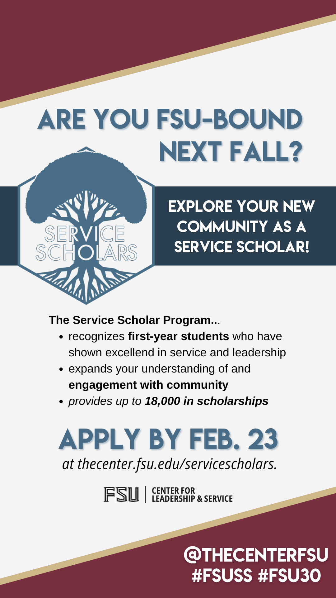Are you an incoming FSU student with a passion for community service? The Service Scholar Program is a 4-year scholarship opportunity offered by @thecenterfsu worth up to $18K! Visit https://thecenter.fsu.edu/ServiceScholars to learn more or apply by Feb. 23 at 6 a.m.